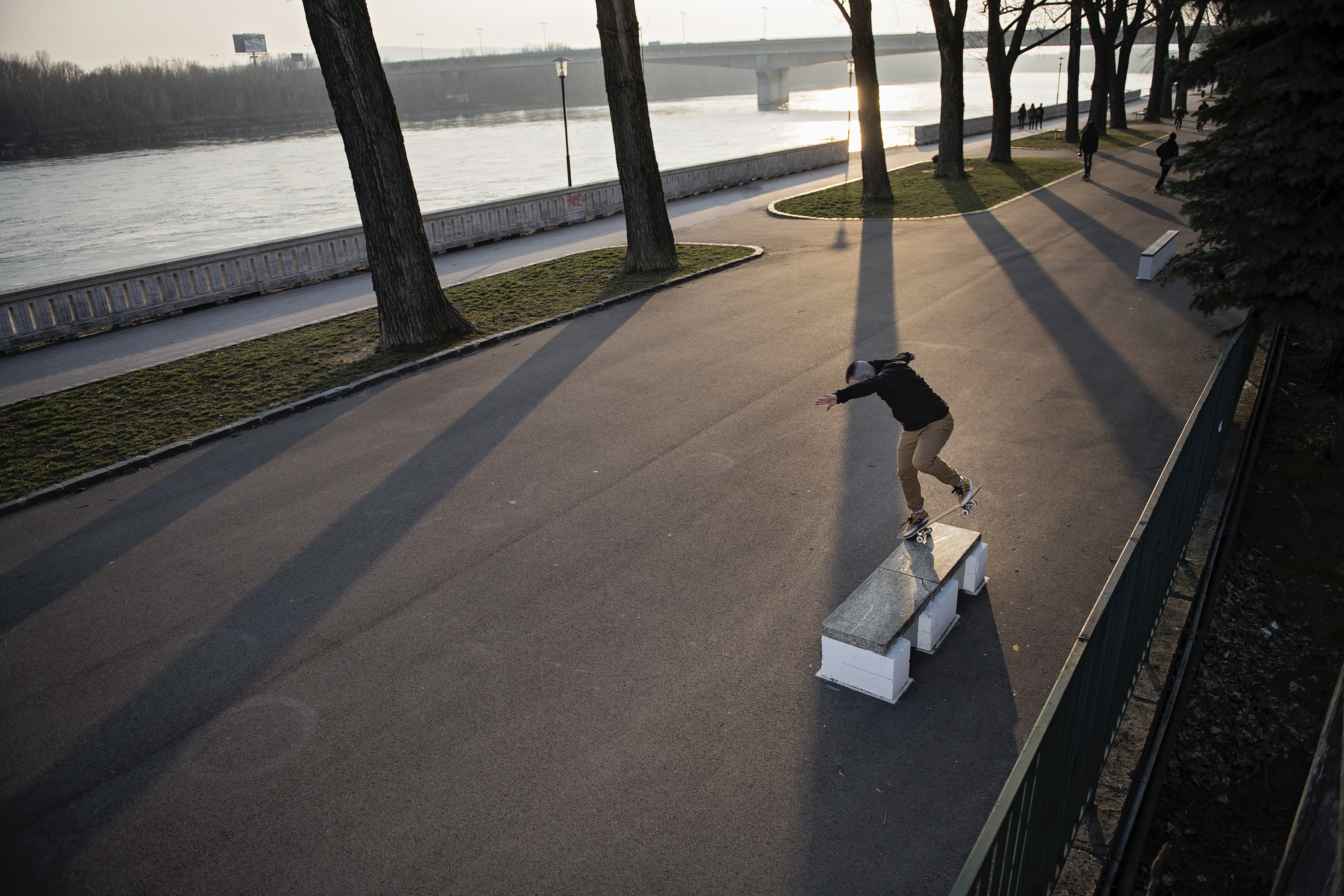 Po krátkom dohadovaní sme sa presunuli na DIY spot na nábreží Dunaja. Braňo využil krásny západ slnka, kulisy stromov a vyfotil niekoľko bomb Richimu a Tomášovi. Richi vyhrotil na fotografiu niekoľko trikov. Za spomienku určite stoja triky ako fs nosebluntslide alebo bs tailslide.