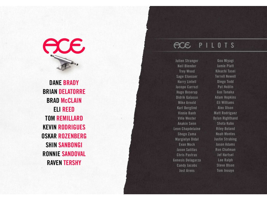 Ace je značka zo San Francisca, ktorá si zakladá na výrobe truckov s čo najlepšou odolnosťou a ovládatelnosťou. V jeho teame nájdeme napríklad Kevin Rodrigues, Oskar Rozenberg, Ronnie Sandoval, Raven Tershy, Alex Olson, Jacopo Carozzi, Didrik Galasso a ďalších.
