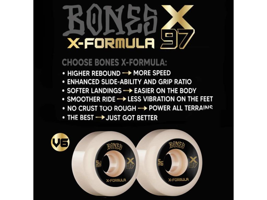 X Formula™ je špeciálne navrhnuté zloženie uretánu z tých najlepších kvalitných zložiek za cieľom získať všetky najlepšie vlastnosti potrebné pre maximálny výkon skateboardového kolieska určeného na street. Spoločnosť BONES® vytvorila v Kalifornii kolieska s podstatne vyššou trvácnosťou, vyššou rýchlosťou. Powerslide ide ako po masle pri zachovaní odolnosti voči plošinkám.