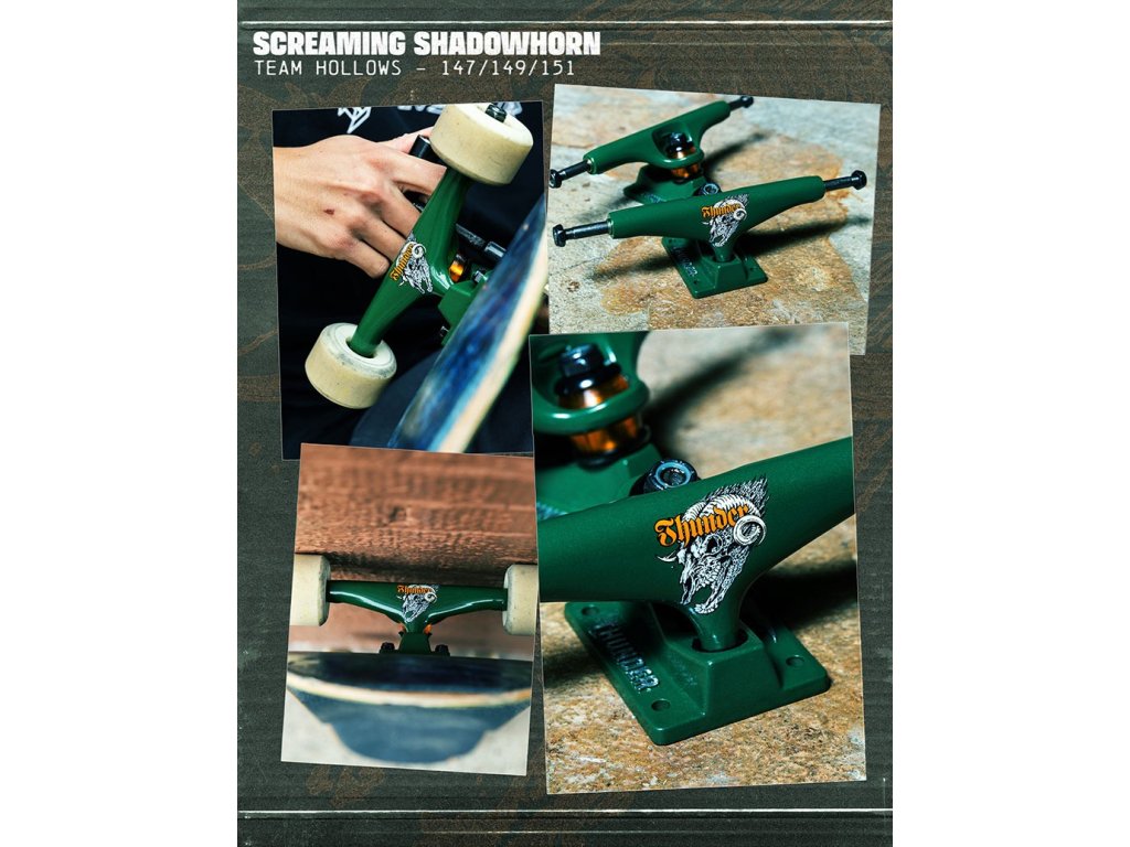 Thunder Trucks SCREAMING SHADOWHORN z kolekcie TEAM HOLLOW patria medzi ľahké trucky, vďaka dutému kingpinu a oske. Thunder vylepšil svoj najľahší model pridaním pevnejšieho baseplate-u, čo síce mierne zvýšilo hmotnosť, ale zároveň truck získal o 1 mm vyššiu výšku a výrazne lepšiu odolnosť. Duté komponenty nijako neznižujú kvalitu ani výdrž truckov. Výsledkom je robustný, no stále ľahký truck, ktorý si obľúbili najmä technickí jazdci pre jeho nízku váhu a spoľahlivosť.