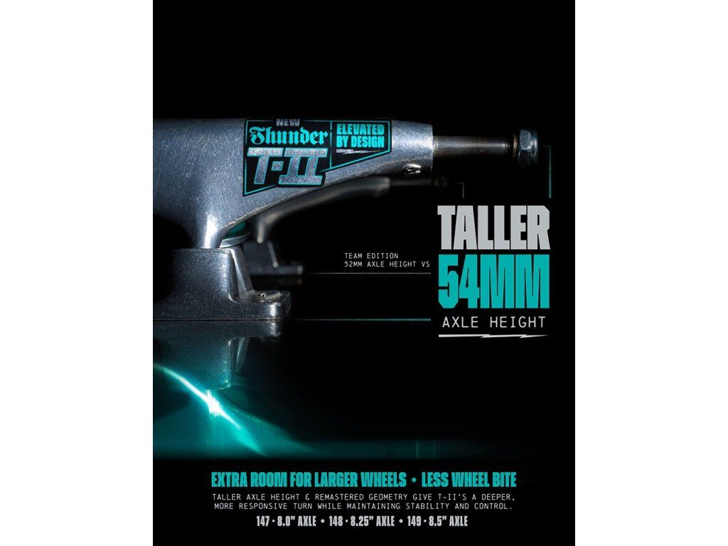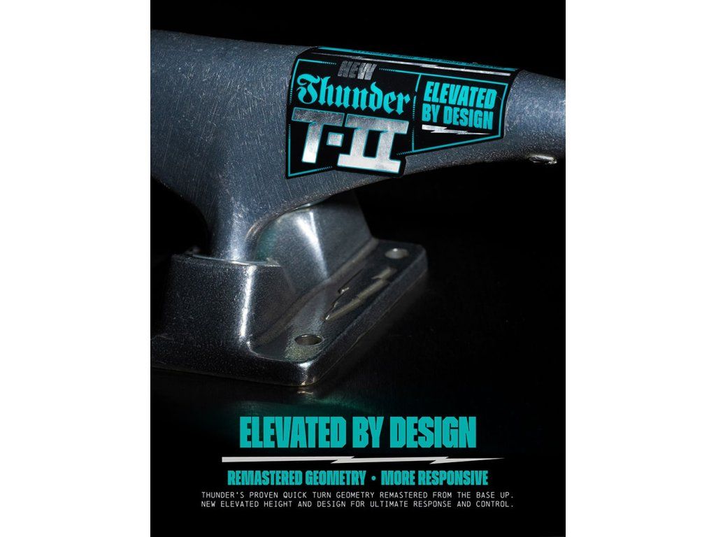 Thunder Trucks predstavuje novinku – modelovú radu T-II, ktorá reaguje na aktuálne požiadavky skejtovej komunity. Tieto trucky sú vyššie než predchádzajúce verzie, s výškou až 54 mm, čo je o 2 mm viac. Nová geometria prináša rýchlejšiu odozvu pri zatáčaní, zatiaľ čo upravený baseplate znižuje trenie koliesok pri trikoch ako tailslide či noseslide. Vylepšený materiál truckov zvyšuje ich odolnosť a predlžuje životnosť. Navyše, nové bushingy a pivot cupy zlepšujú celkový pocit z jazdy a kontrolu nad doskou.